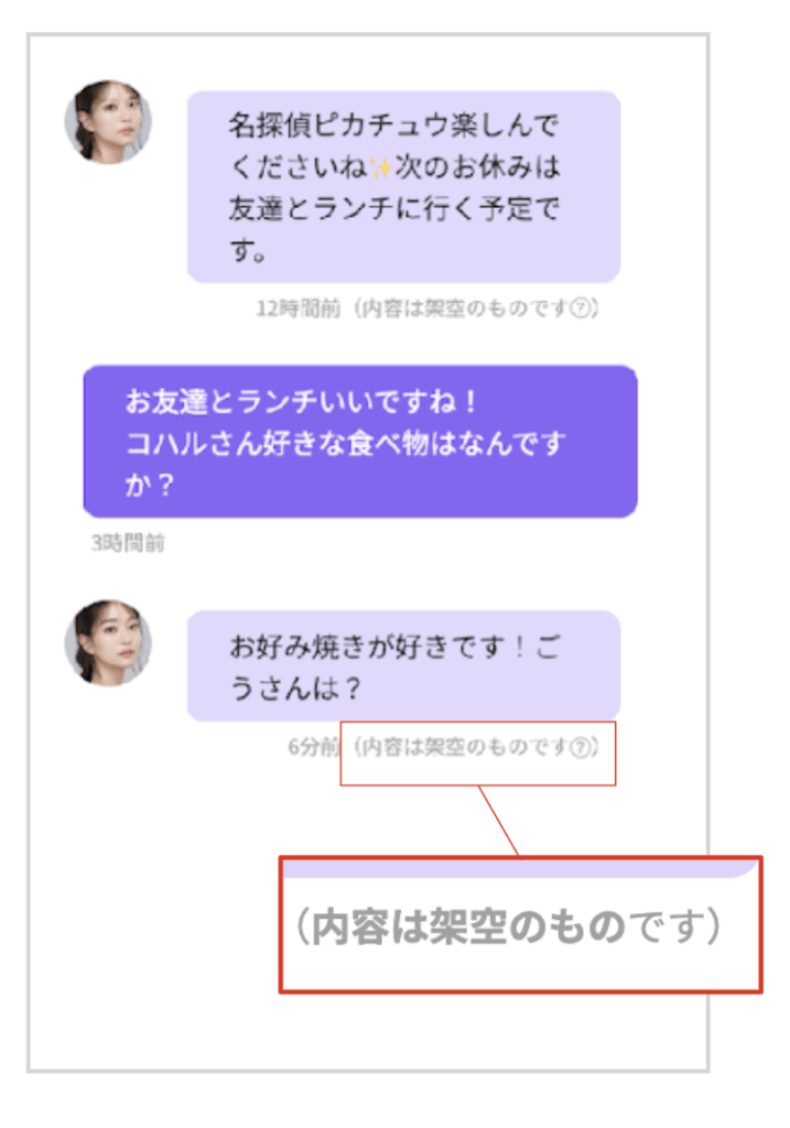 お相手から届くメッセージには必ず「内容は架空のものです」という注意書きを行なっています。