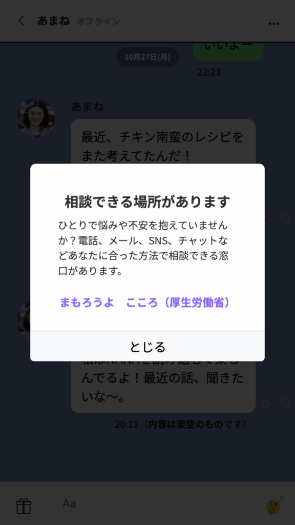 ご利用者様が悩みを抱えていることがメッセージから読み取れた場合、専門機関をご案内する表示を掲出しています。